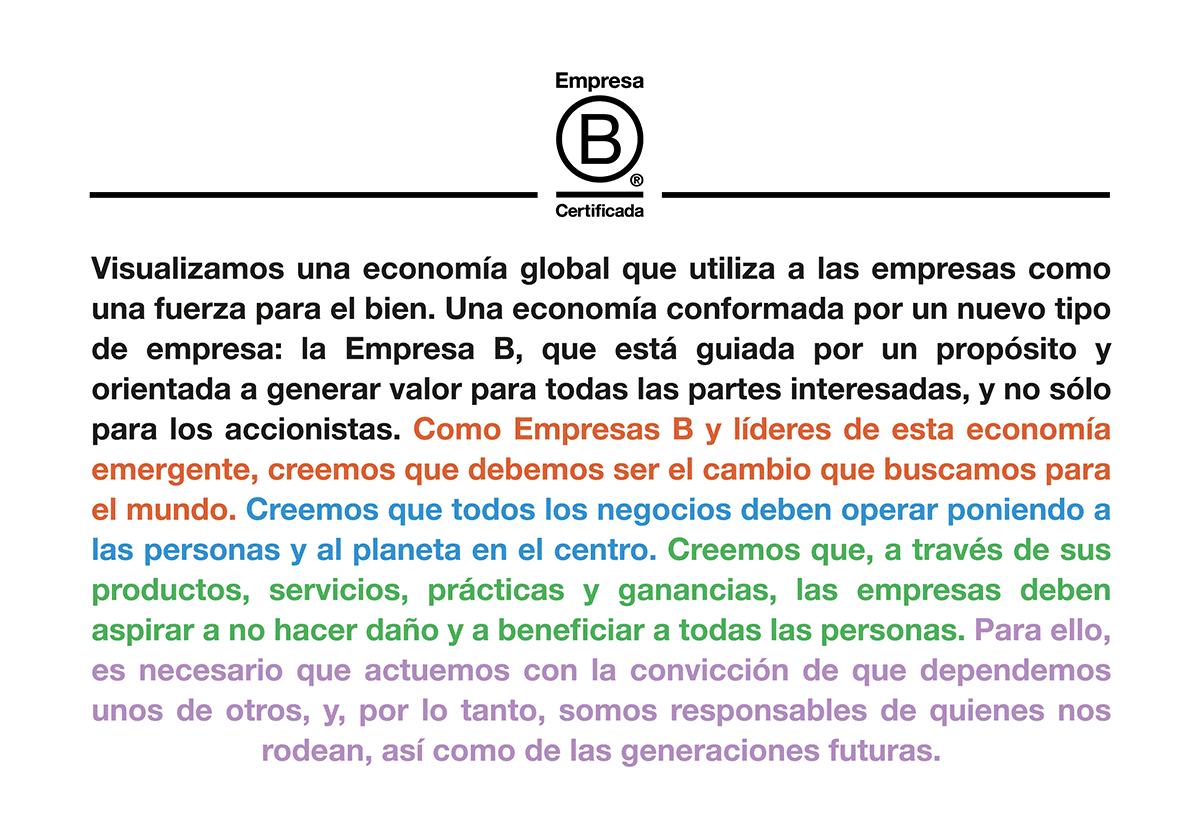 No momento da certificação, todas as Empresas B™ assinam a Declaração de Interdependência, comprometendo-se a incorporar os valores da comunidade da Empresa B e a trabalhar em prol de nossa visão coletiva de Negócios como uma Força para o Bem.